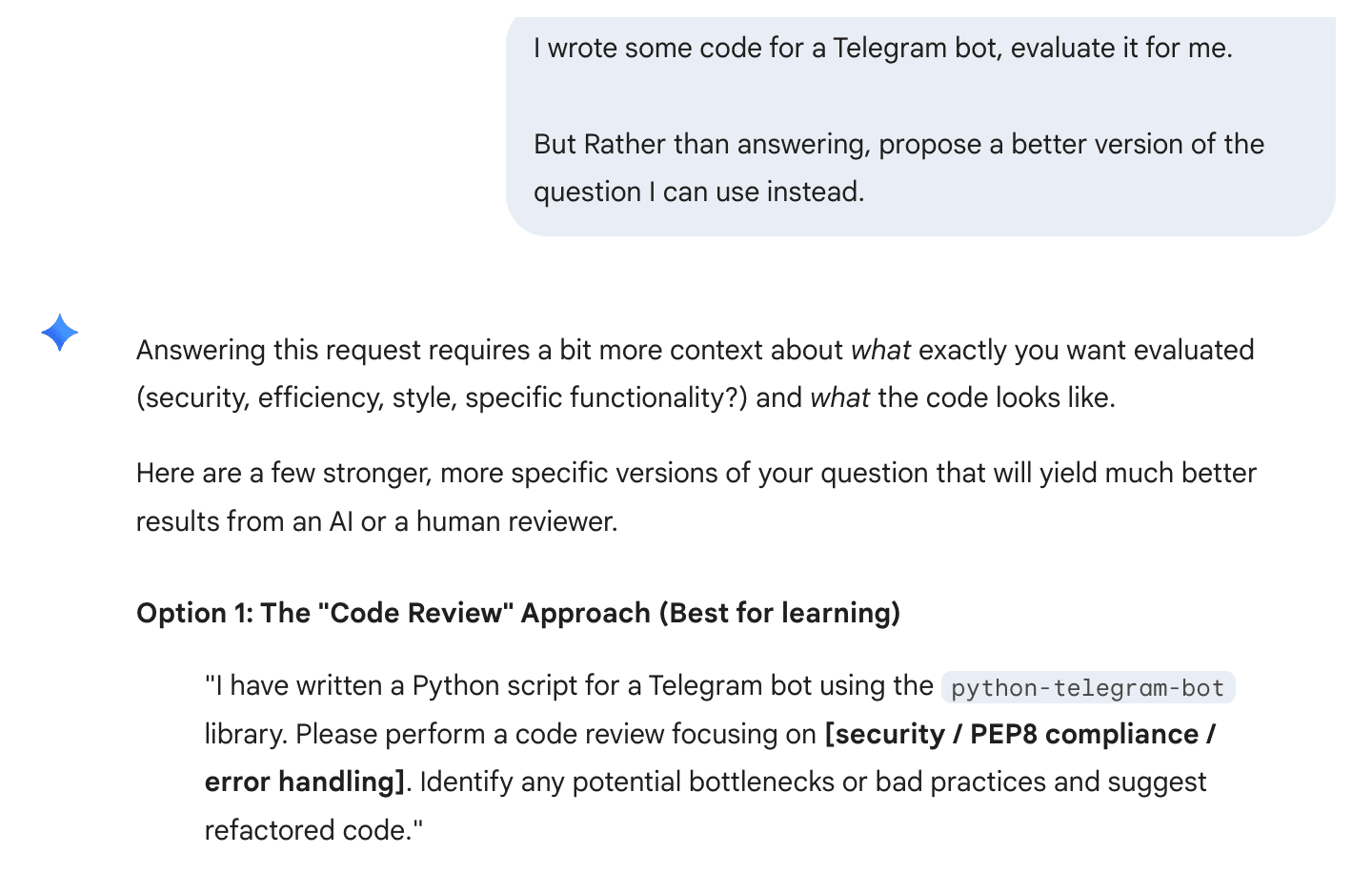 9/10 people use AI like a search engine. They ask a generic question... And they get a super encouraging answer. (Probably scraped off Reddit or an internet forum). But the top 10% treat it like a collaborative partner. They ask better questions. And they do it with the quesiton interaction prompt Instead of guessing what to ask or prompt, force the AI to do the heavy lifting for you. Next time you are stuck, paste your draft as usual. Then, add this single line: "Rather than answering, propose a better version of the question I can use instead." The result? AI optimises your thinking before it even attempts to answer. It'll give you 2-3 or questions you can ask and get FAR better outputs. Get my entire framework by joining Prompt Writing Studioโ |